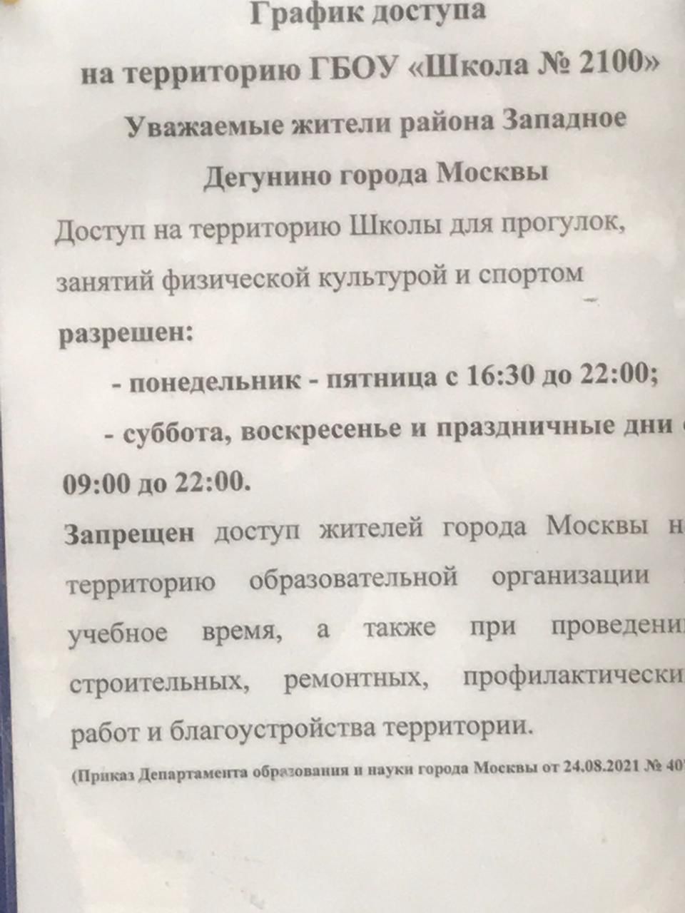 В соответствии с графиком доступа, территория ГБОУ «Школа №2100», открыта для прогулок, занятий физической культурой и спортом для жителей города Москвы в выходные дни с 09:00 до 22:00. По факту Вашего обращения проведен дополнительный инструктаж с сотрудниками охранной организации. По всем вопросам, касающимся организации административно-хозяйственной деятельности учреждения, Вы можете обратиться к заместителю директора Потапову Евгению Игоревичу, по т. +7 (915) 012-60-34, эл. почта: potapovei@2100msk.ru.